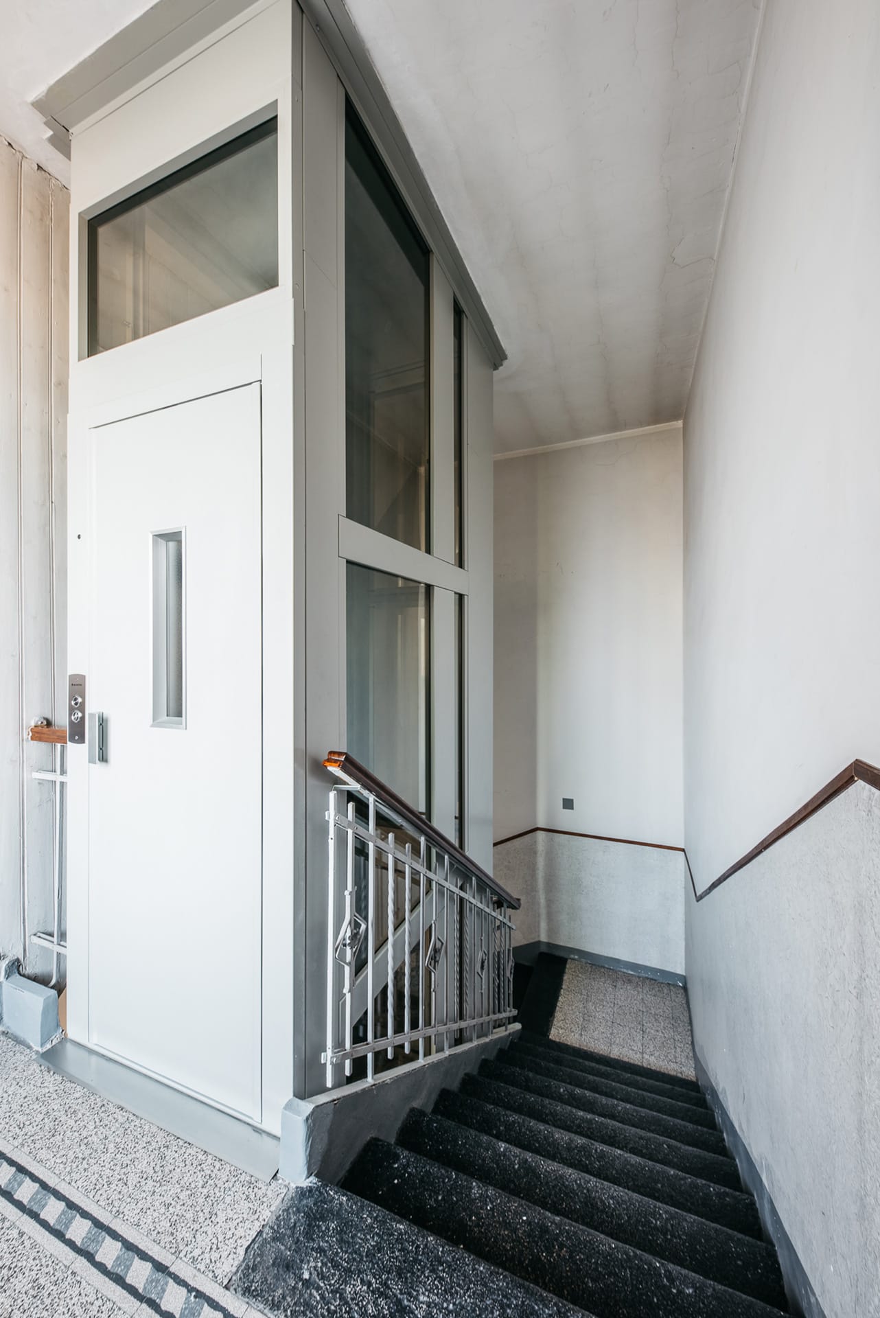Il lavoro ha richiesto particolare attenzione, anche in questo caso gli spazi erano molto ristretti e hanno richiesto il taglio della scala, la successiva realizzazione su misura di un castelletto autoportante e una meccanica sospesa a ponte. Questo elevatore è stato realizzato con porta a battente, 5 fermate e cabina in acciaio satinato.